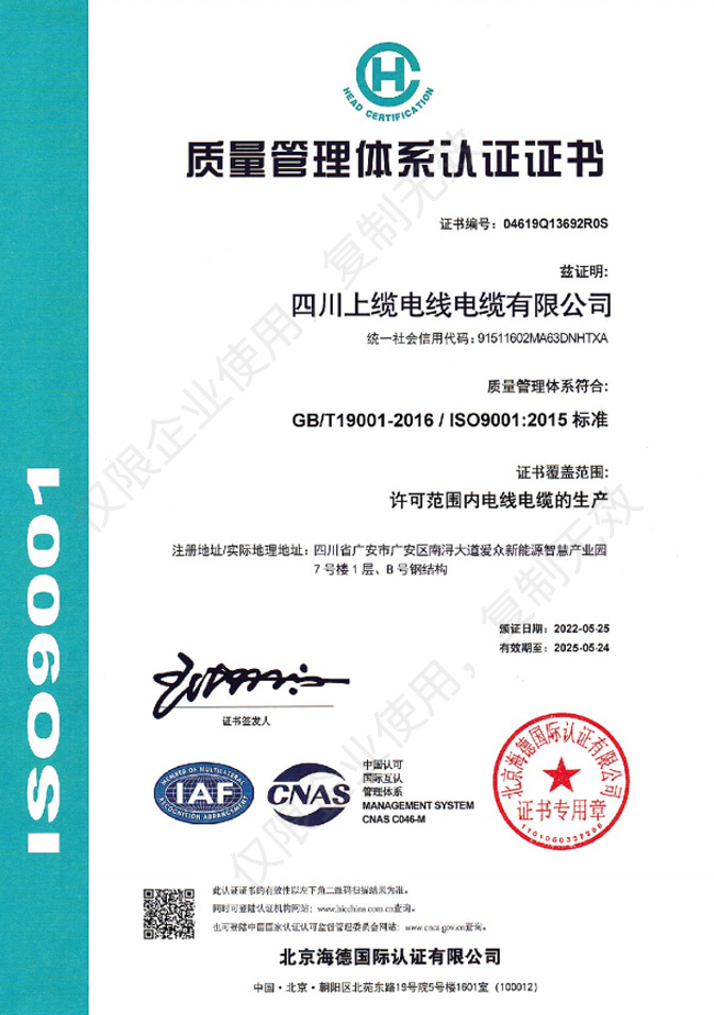 我公司生产的电线电缆产品,全部采用国际IEC电工委员会标准生产,公司通过ISO9001-2015质量管理体系认证。公司检验设备齐全,生产设备先进,目前生产的产品已销往全国多个地区,并在电力、煤炭、石油、化工、冶金、建筑、铁路交通、高速公路、通信以及城市基础设施中被广泛应用。